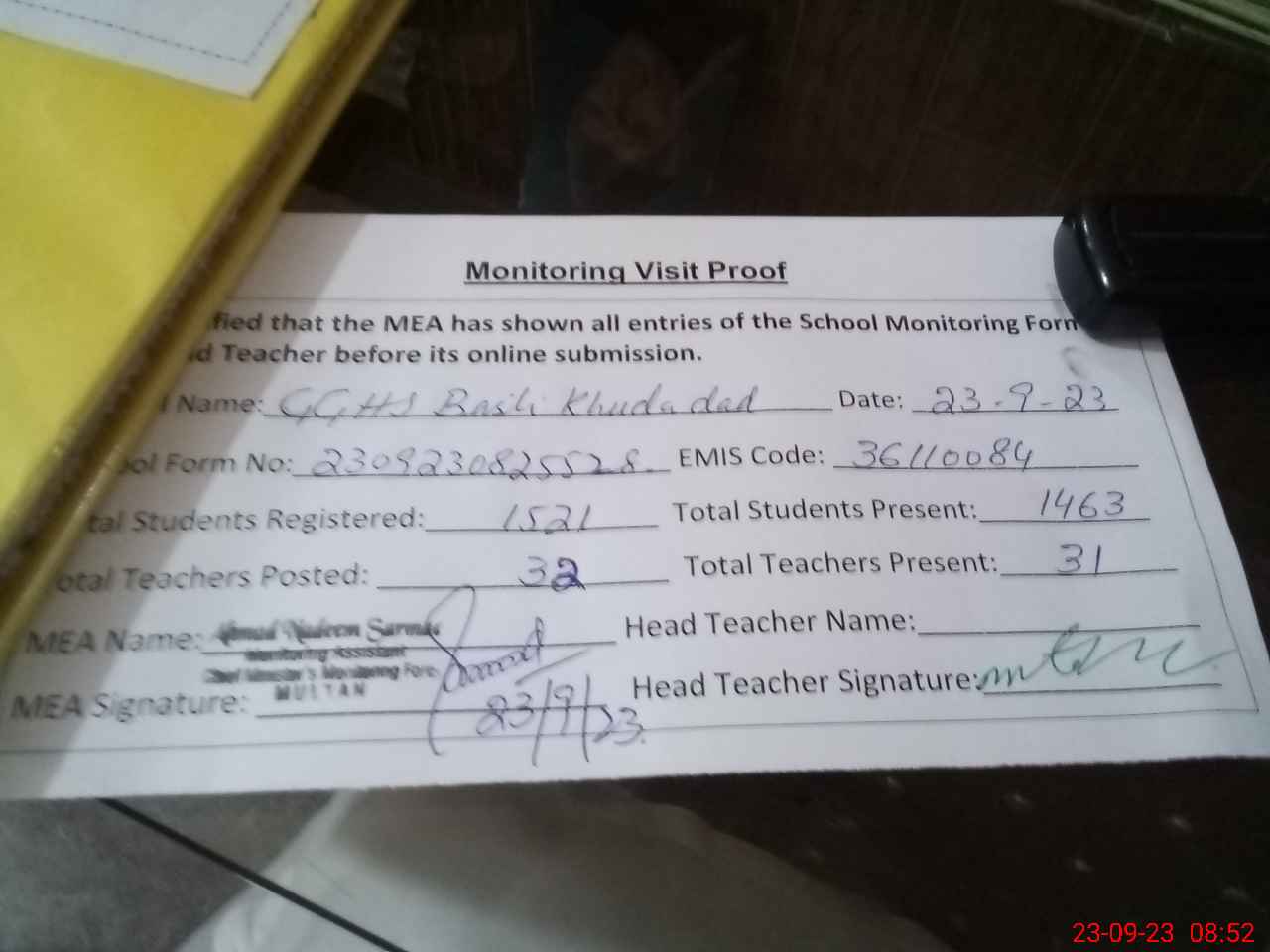 | Attendance Register | Head Teacher | MEA with School | Visit Proof |