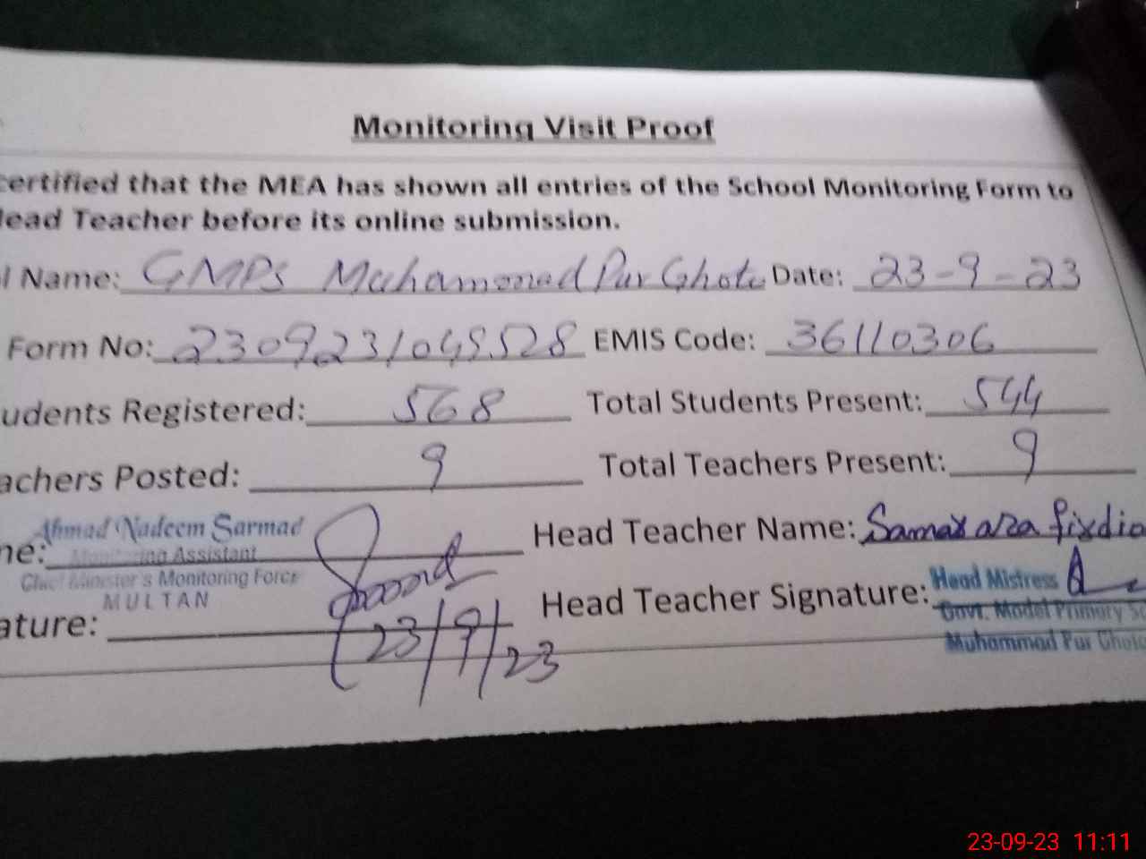 | EMIS Code: 36110306 | Name of School: GMPS MUHAMMAD PUR GHOTA MULTAN | |||