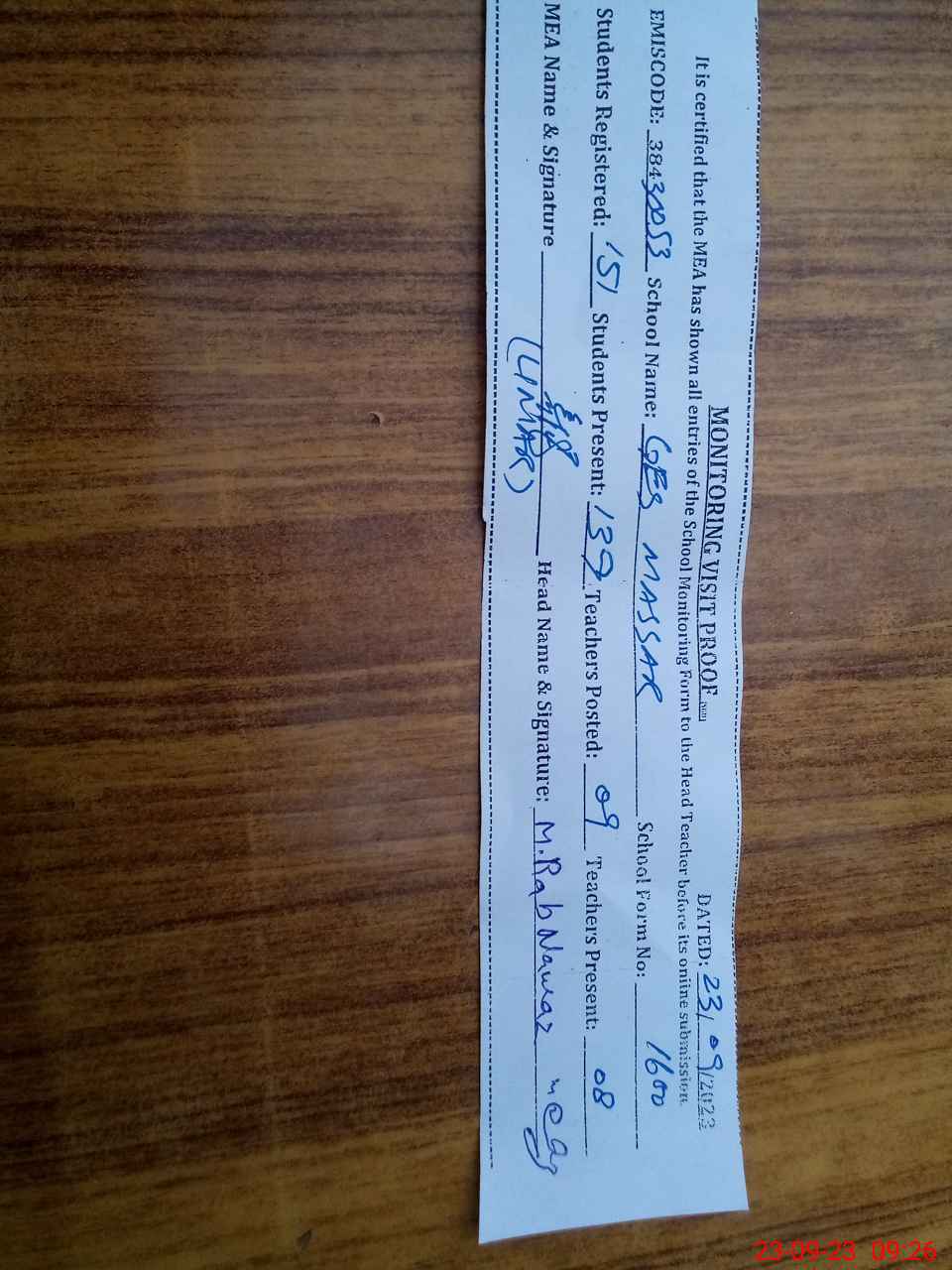 | Attendance Register | Head Teacher | MEA with School | Visit Proof |
