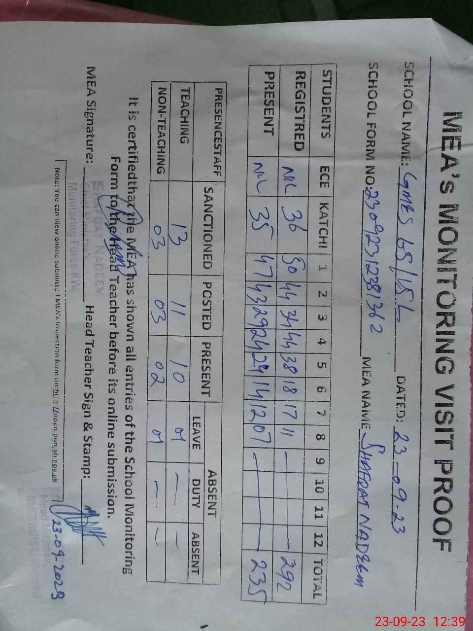 | Attendance Register | Head Teacher | MEA with School | Visit Proof |
