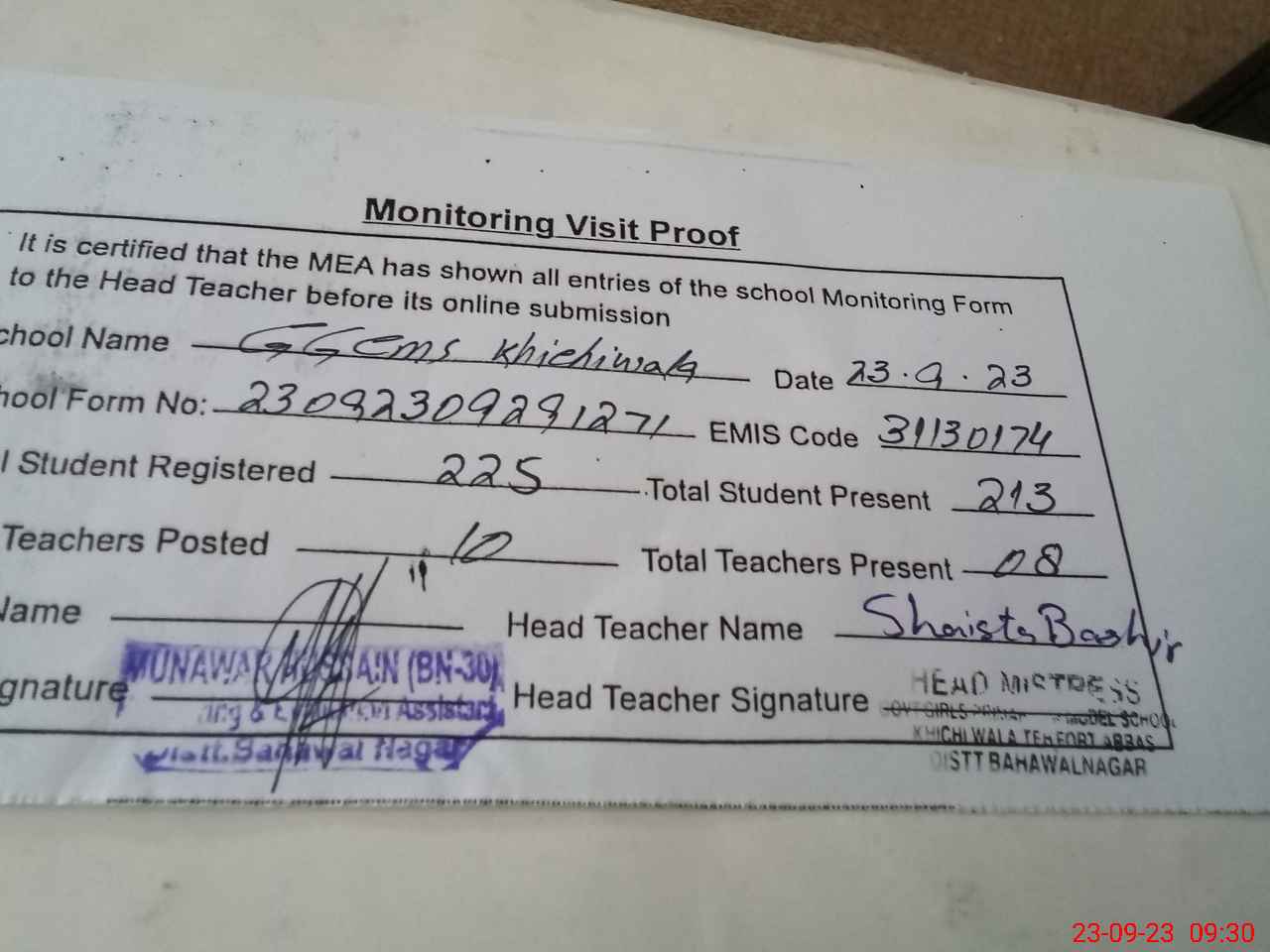 | Attendance Register | Head Teacher | MEA with School | Visit Proof |