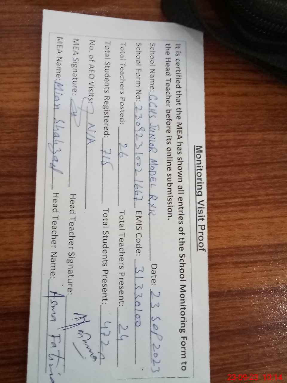 | Monitoring Date: 23-09-2023 | Start Time: 23-09-2023 09:18 AM | End Time: 23-09-2023 10:15 AM | Name of MEA: Sh**** Ah**** | |