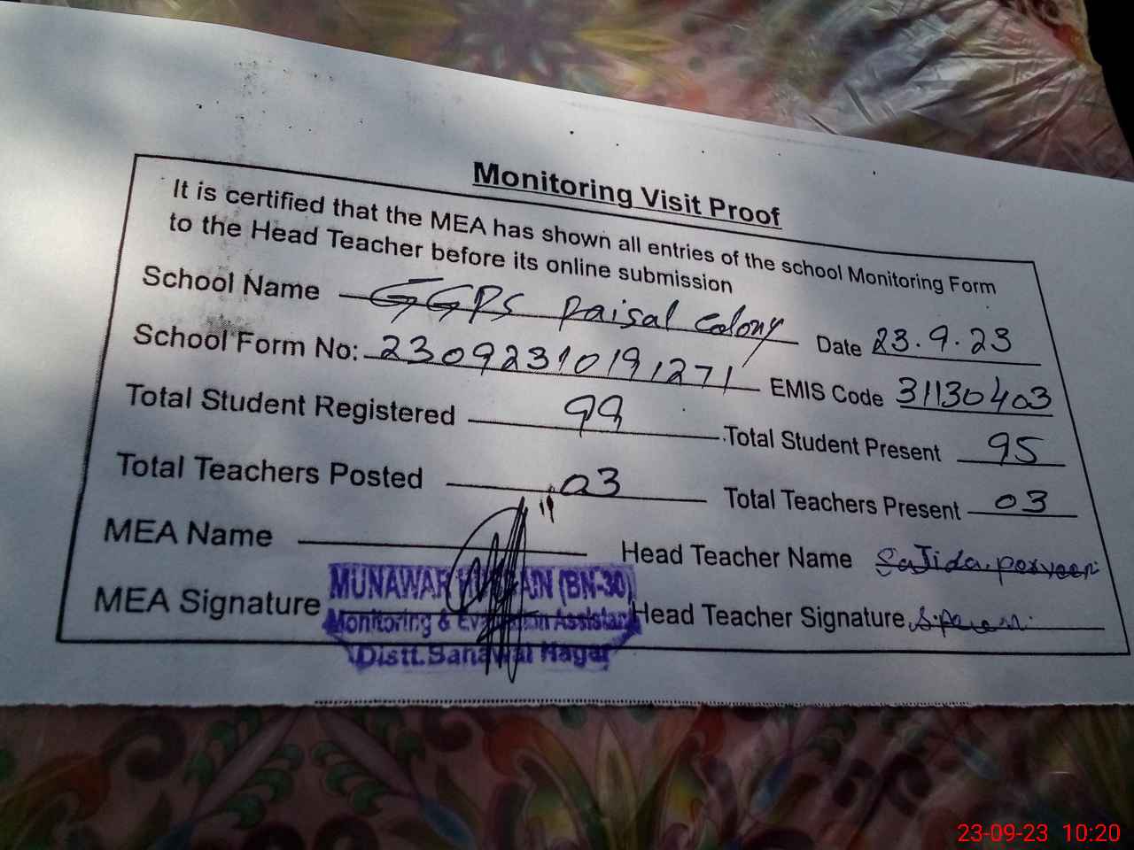 | EMIS Code: 31130403 | Name of School: GGPS FAISAL COLONY | |||