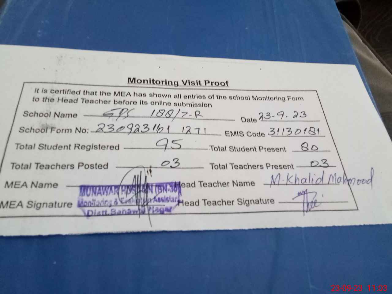 | Attendance Register | Head Teacher | MEA with School | Visit Proof |