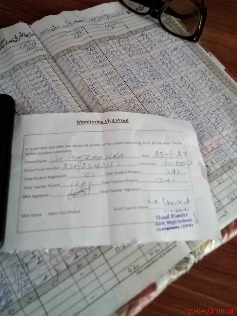 | Attendance Register | Head Teacher | MEA with School | Visit Proof |