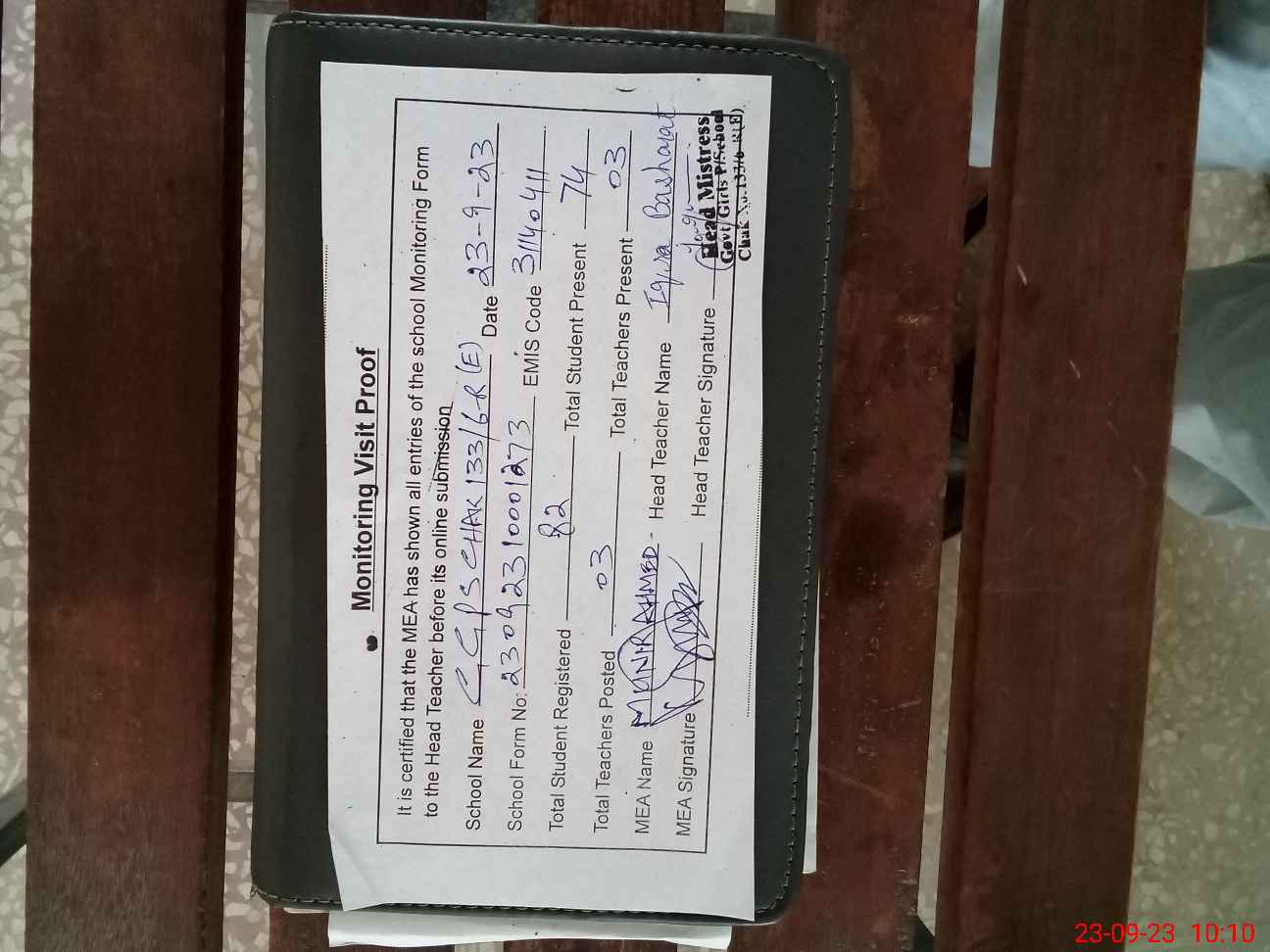 | Attendance Register | Head Teacher | MEA with School | Visit Proof |