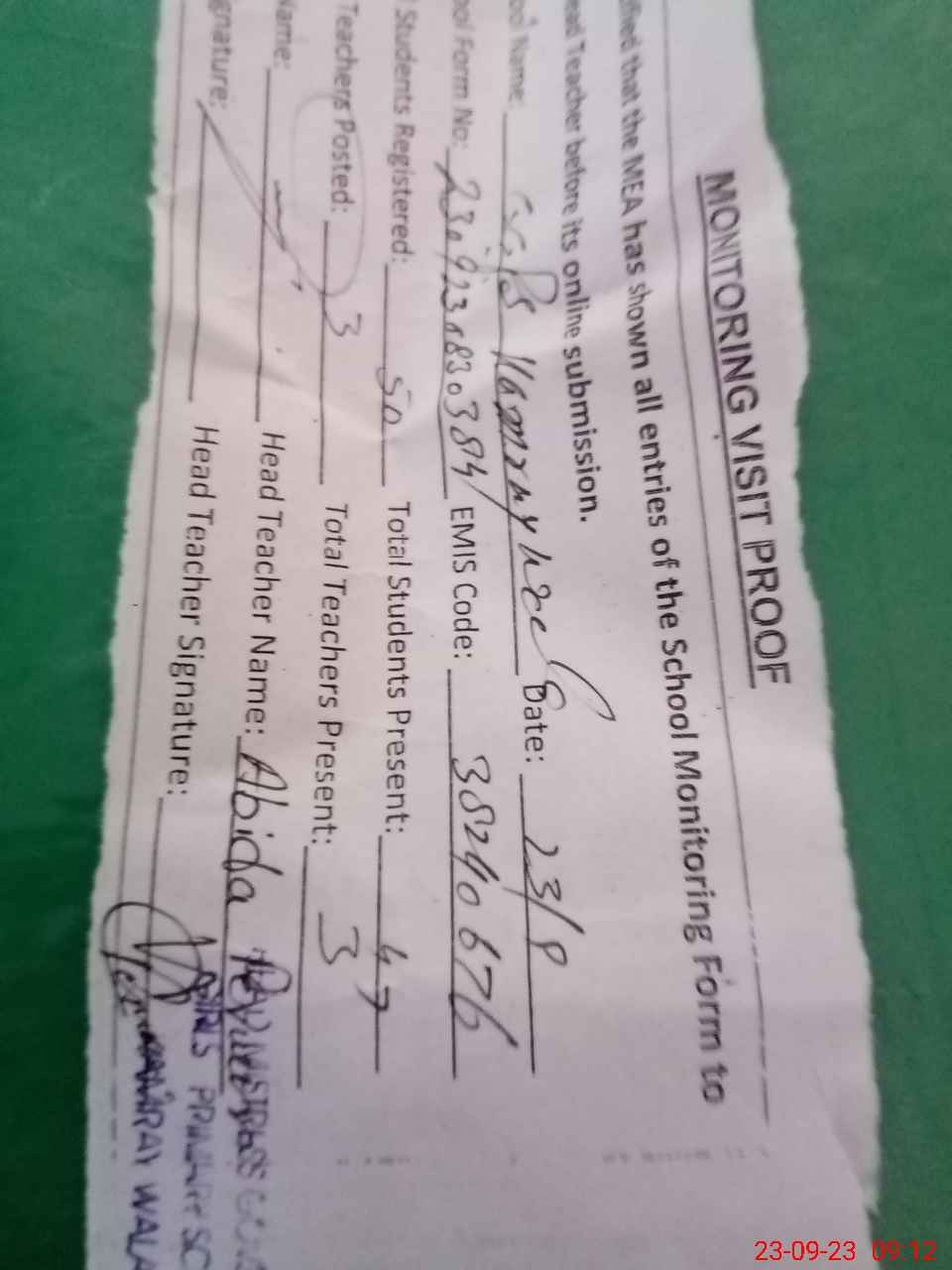 | Attendance Register | Head Teacher | MEA with School | Visit Proof |