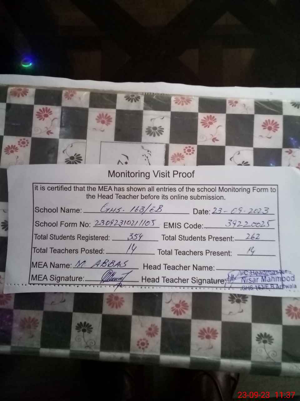| Attendance Register | Head Teacher | MEA with School | Visit Proof |