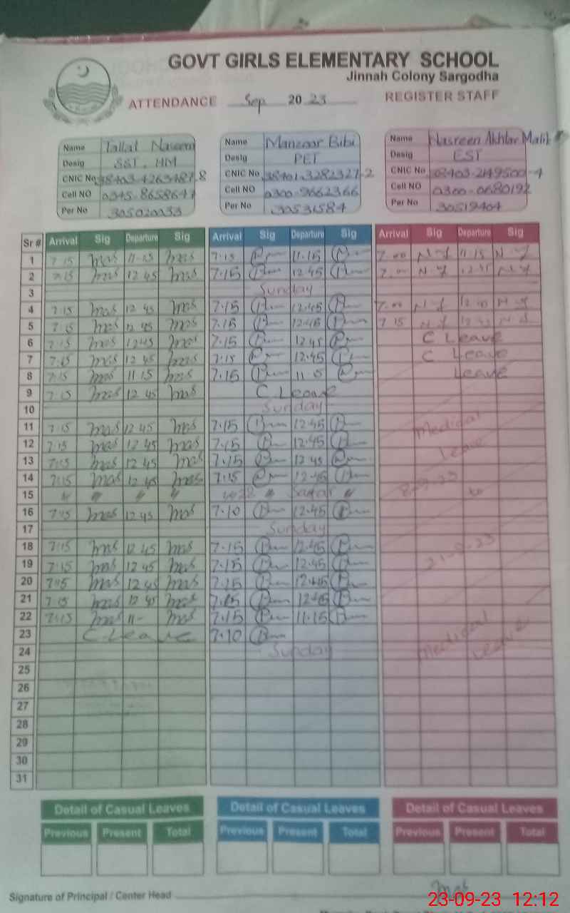 | CNIC | Full Name | Designation | R/C | Absence During Last Calender Month |