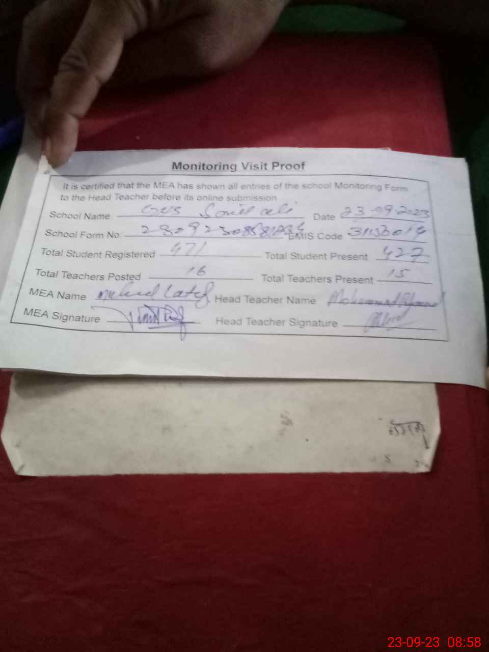 | Attendance Register | Head Teacher | MEA with School | Visit Proof |