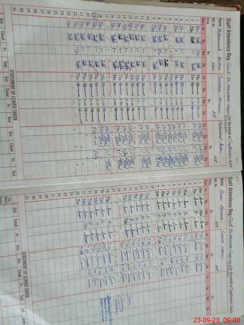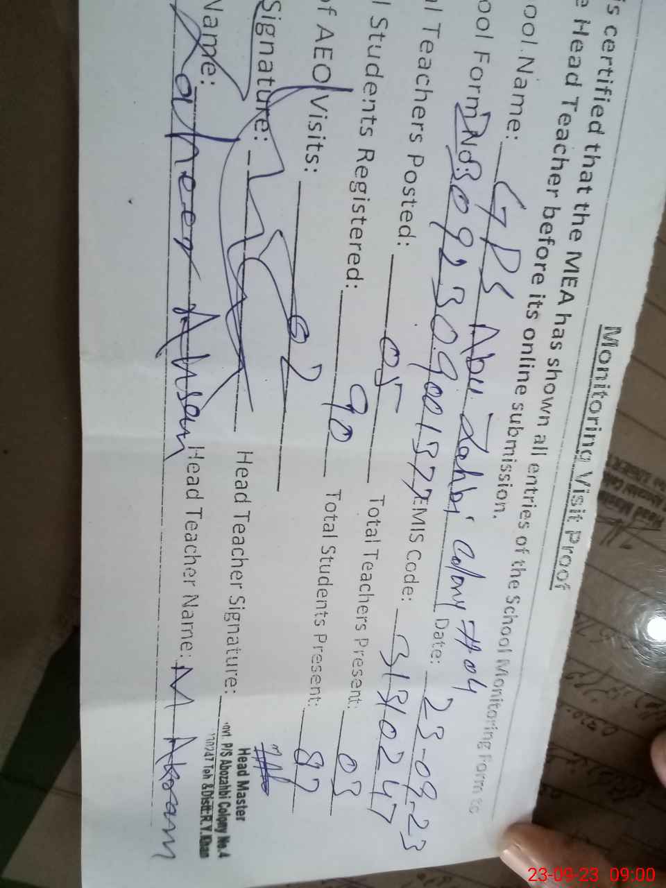 | Monitoring Date: 23-09-2023 | Start Time: 23-09-2023 08:11 AM | End Time: 23-09-2023 09:05 AM | Name of MEA: Za**** Ah**** | |
