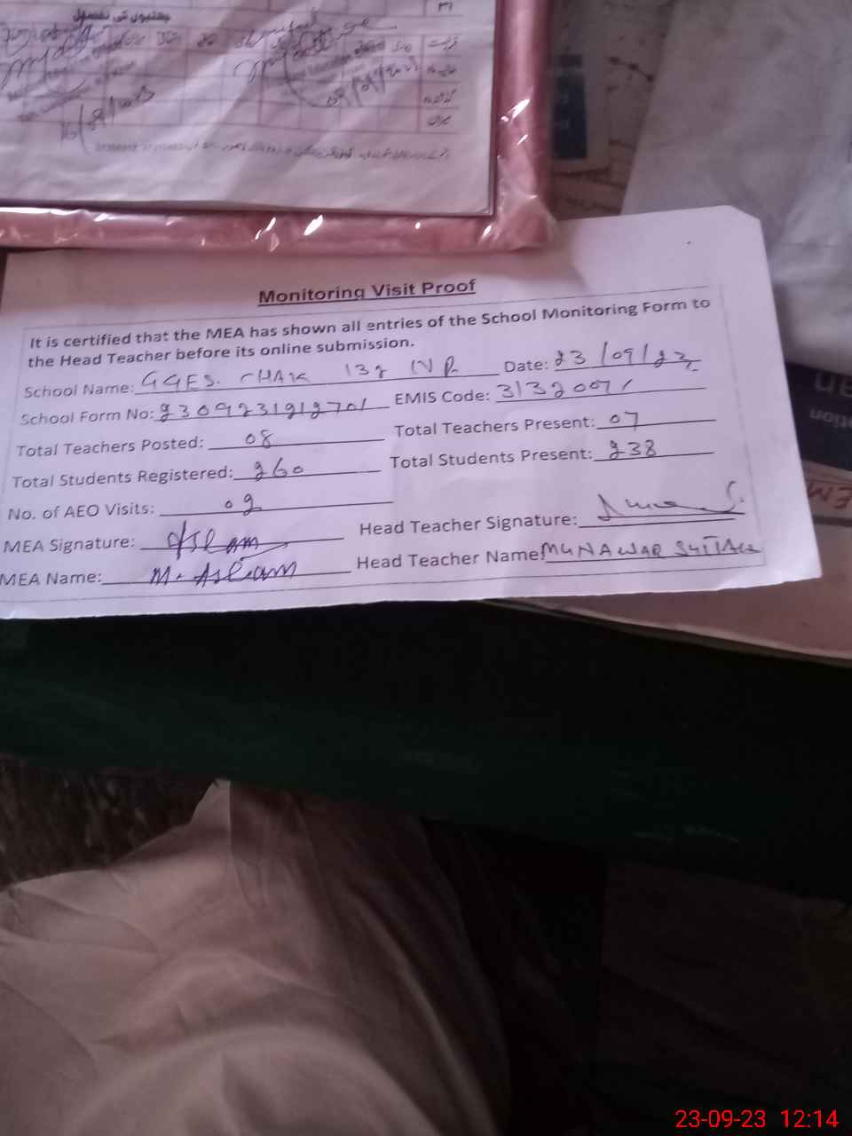 | Attendance Register | Head Teacher | MEA with School | Visit Proof |