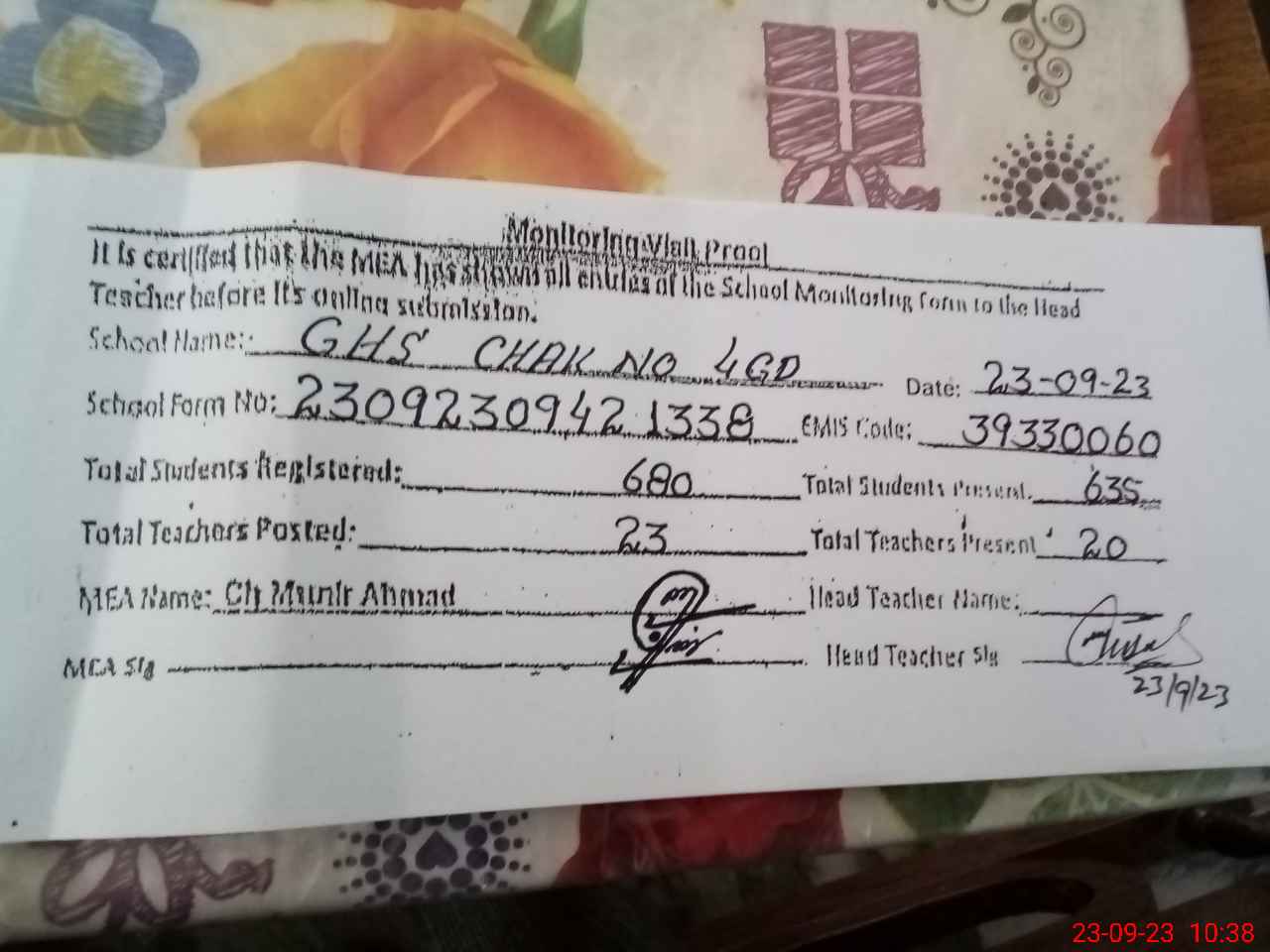 | Name: ChZu**** Al**** Designation: (School Headmaster's/Headmistress's) S. HM Phone/Cell Number: 03**** |