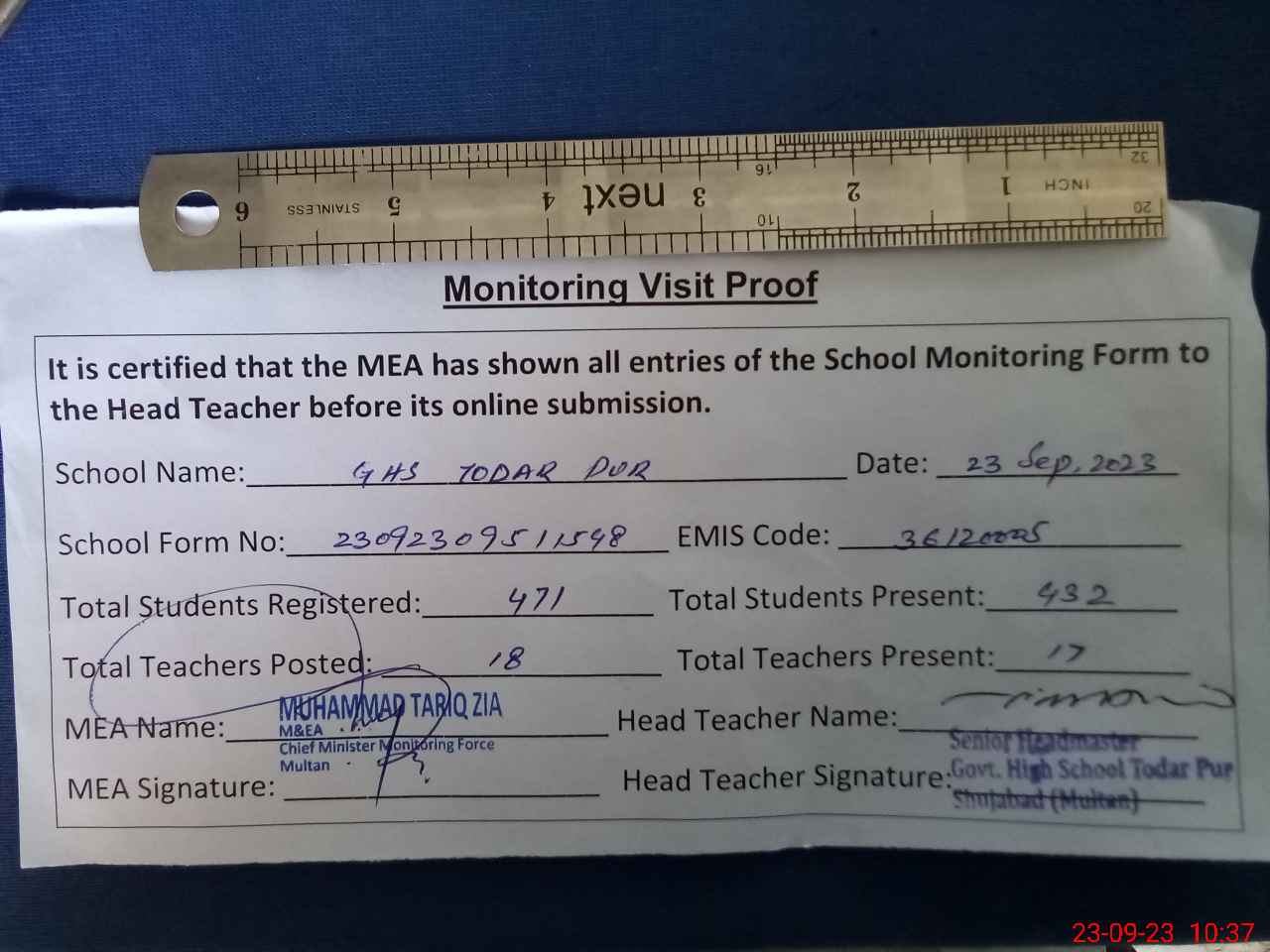| Attendance Register | Head Teacher | MEA with School | Visit Proof |