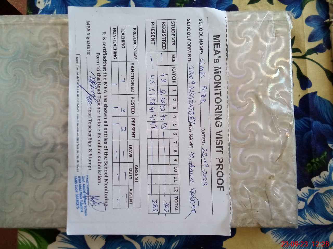 | Attendance Register | Head Teacher | MEA with School | Visit Proof |