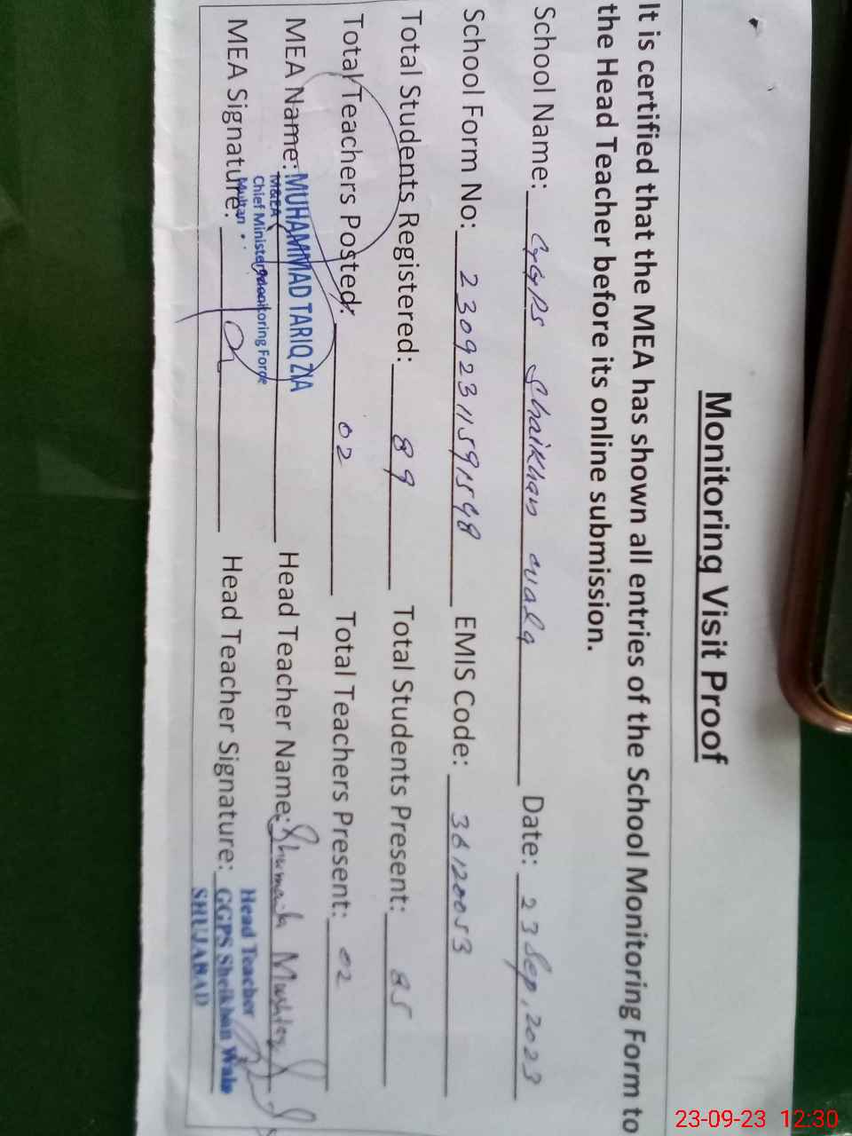 | Attendance Register | Head Teacher | MEA with School | Visit Proof |