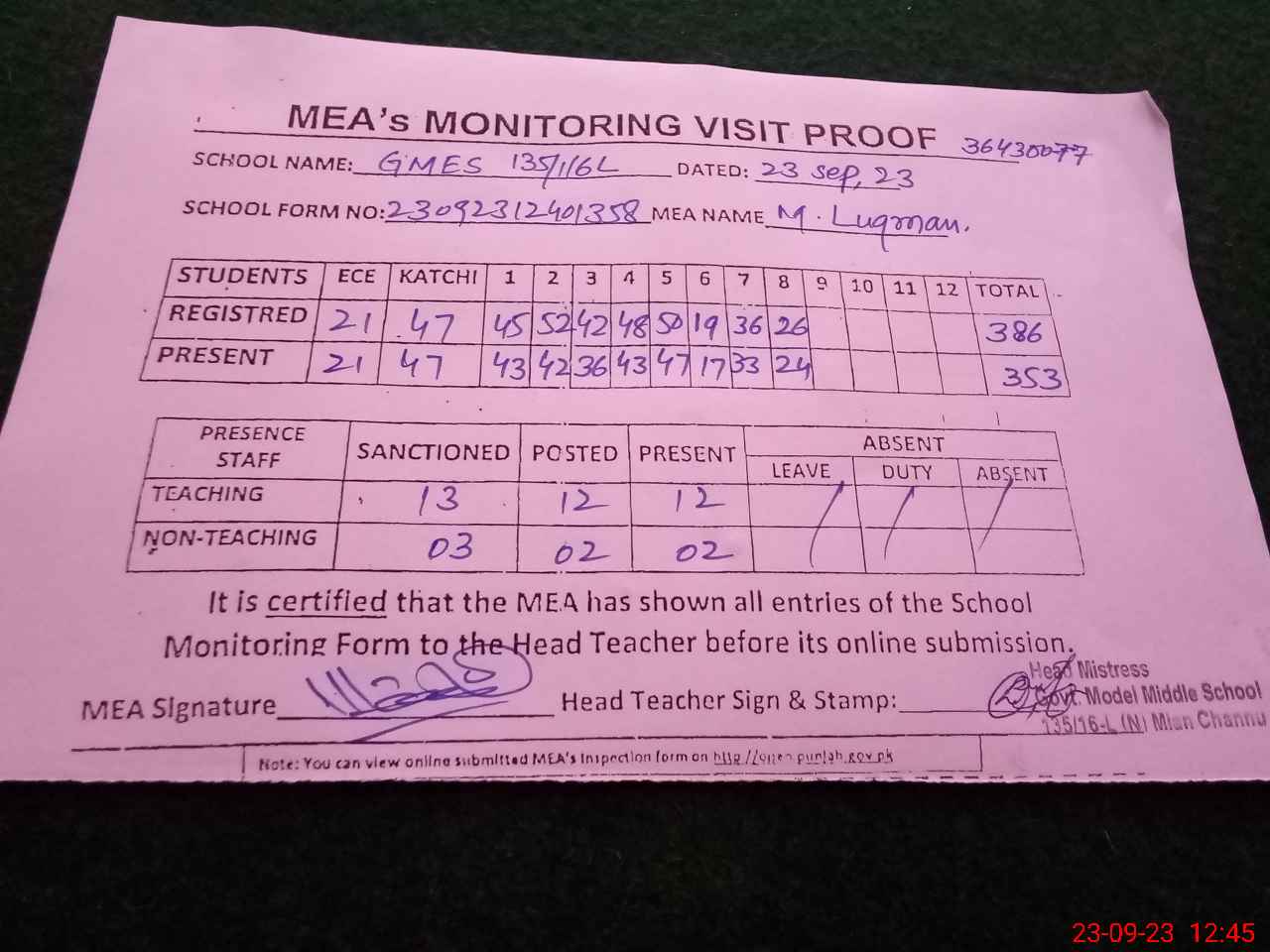 | Attendance Register | Head Teacher | MEA with School | Visit Proof |