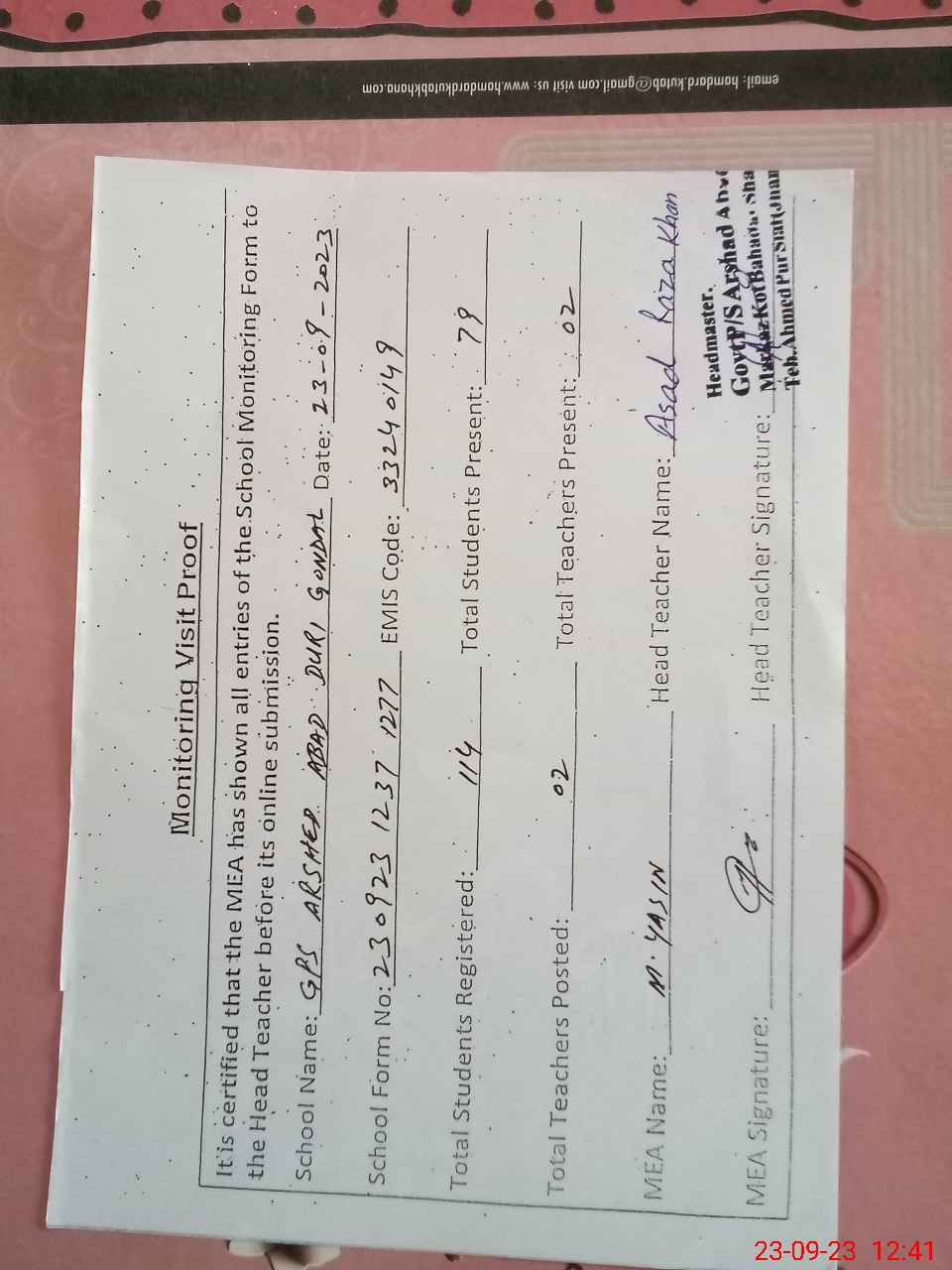 | Attendance Register | Head Teacher | MEA with School | Visit Proof |