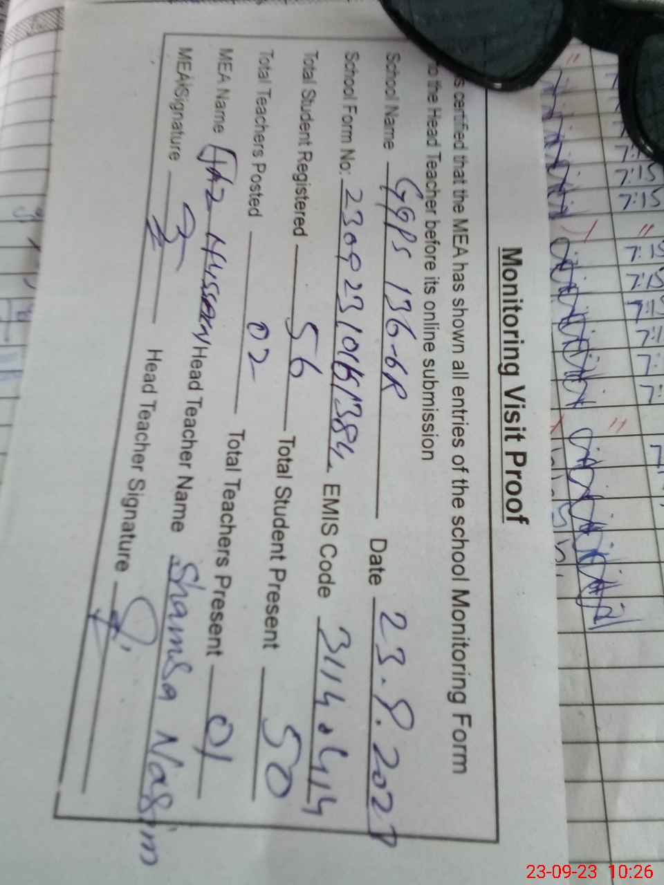 | Attendance Register | Head Teacher | MEA with School | Visit Proof |