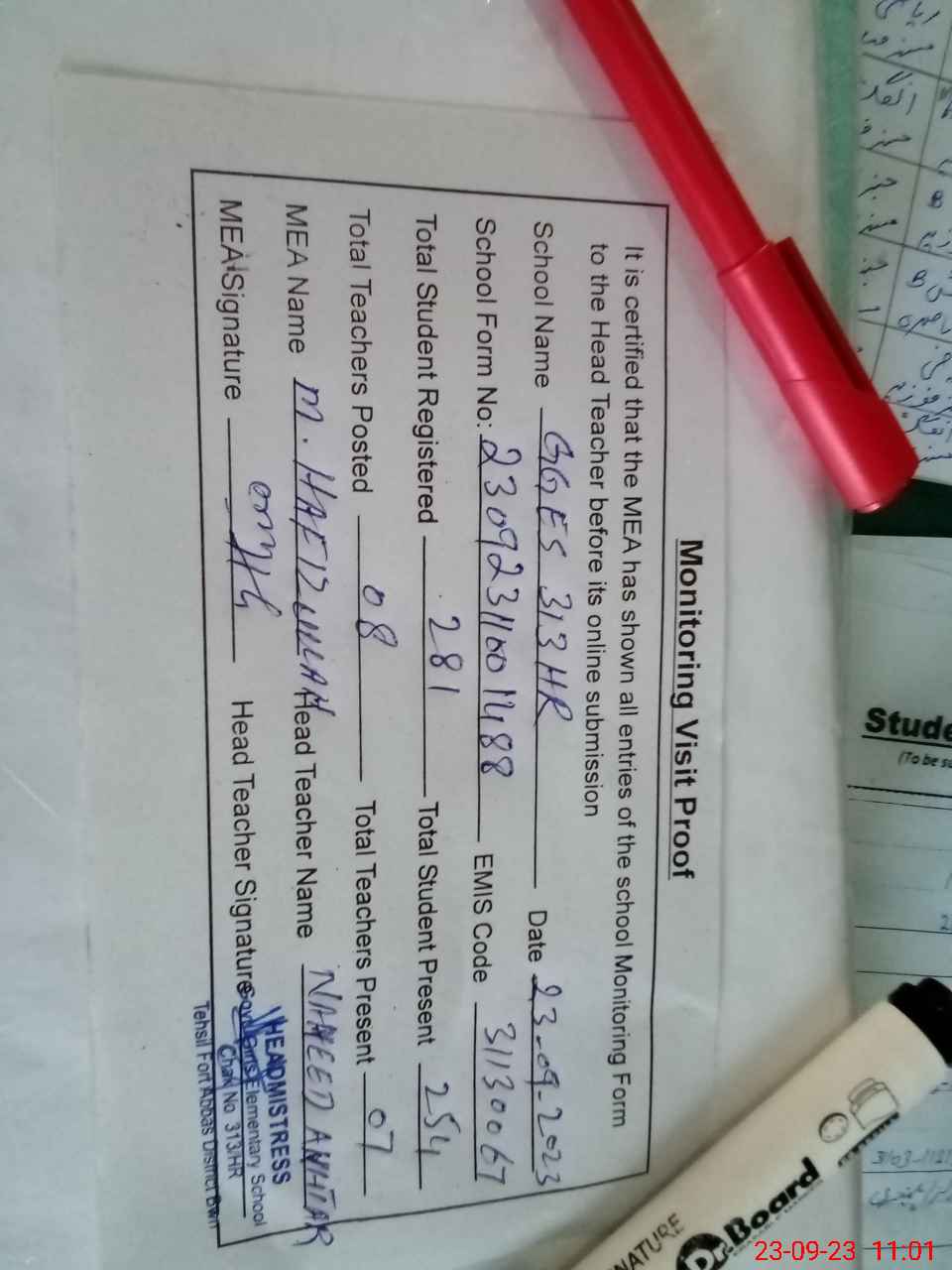 | Attendance Register | Head Teacher | MEA with School | Visit Proof |