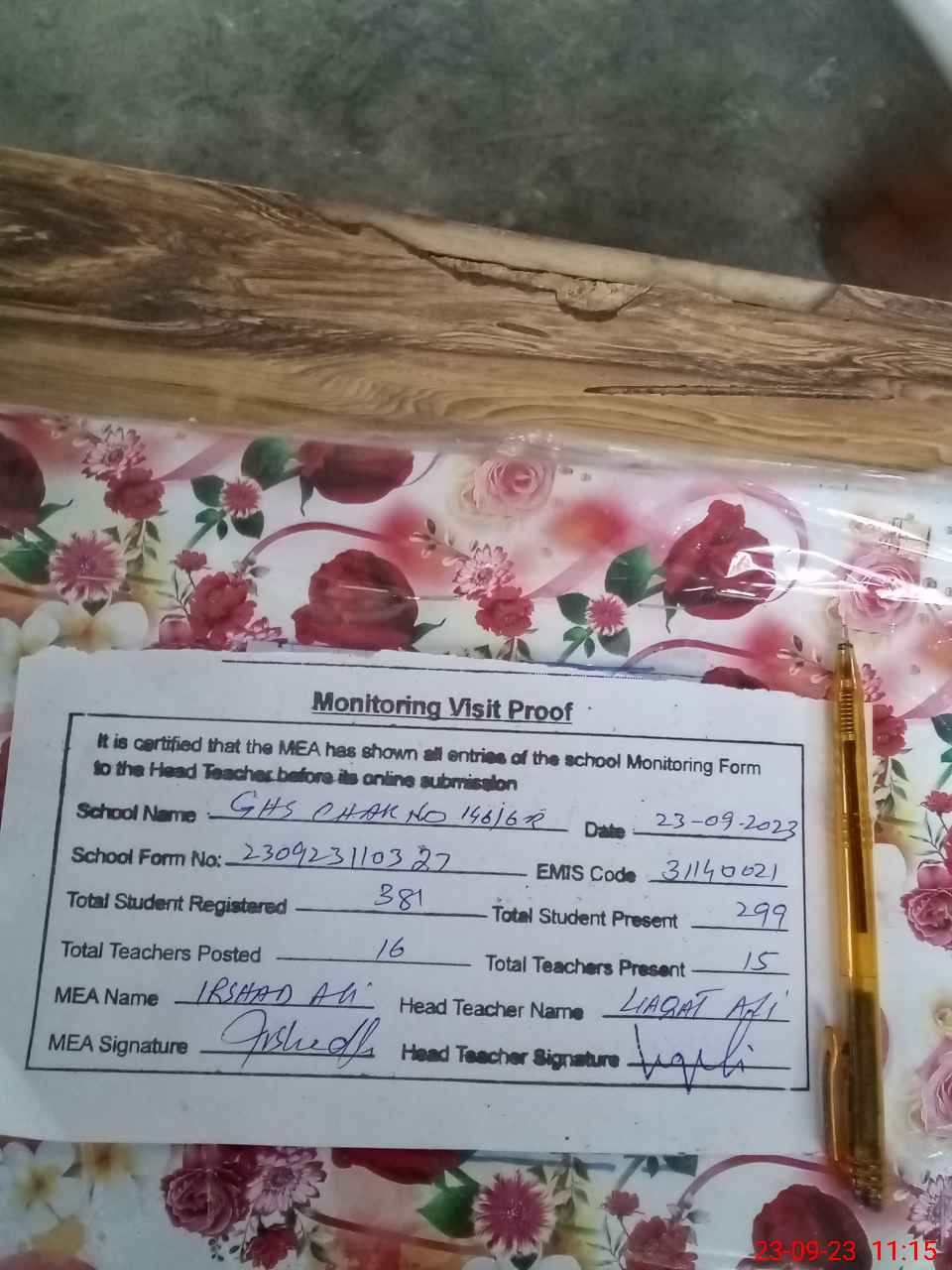 | Attendance Register | Head Teacher | MEA with School | Visit Proof |