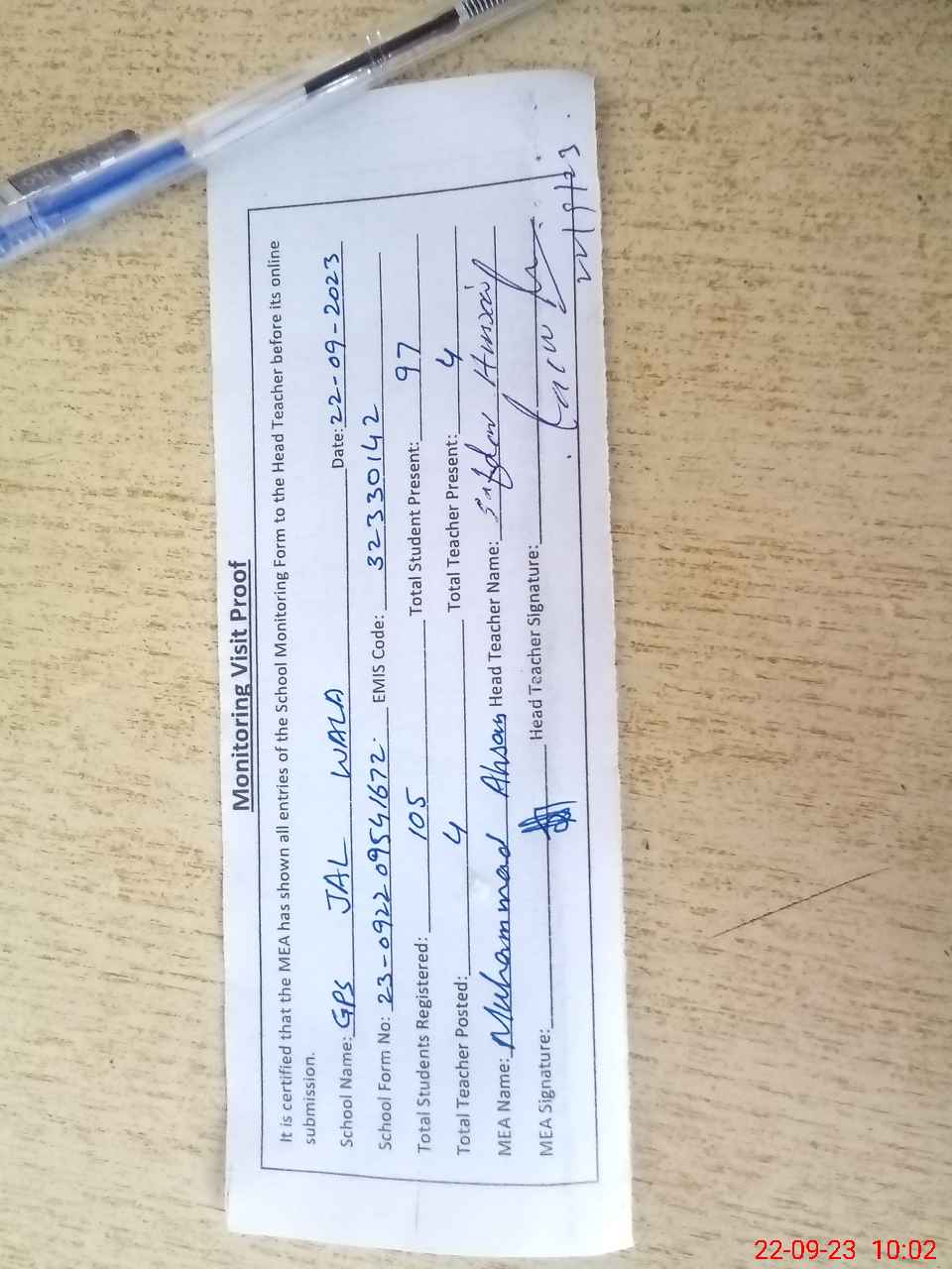 | Attendance Register | Head Teacher | MEA with School | Visit Proof |