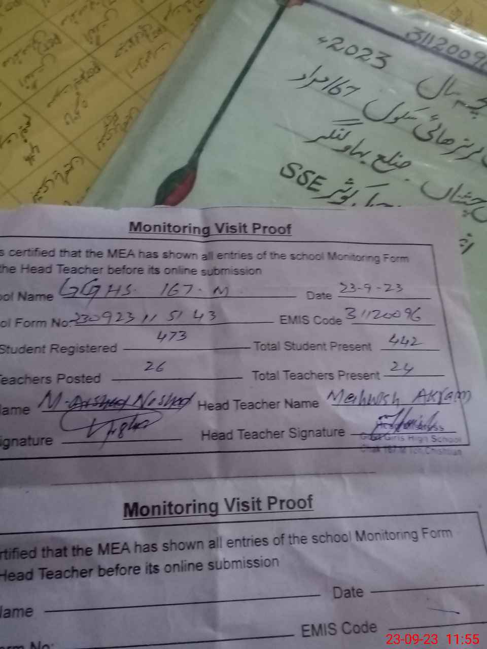 | Attendance Register | Head Teacher | MEA with School | Visit Proof |