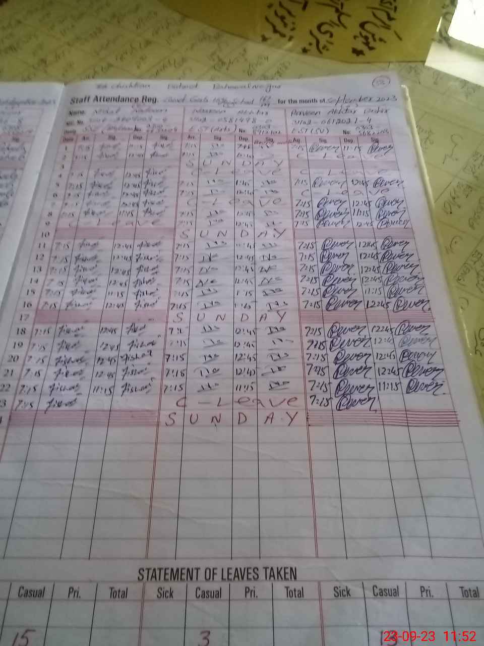 | CNIC | Full Name | Designation | R/C | Absence During Last Calender Month |