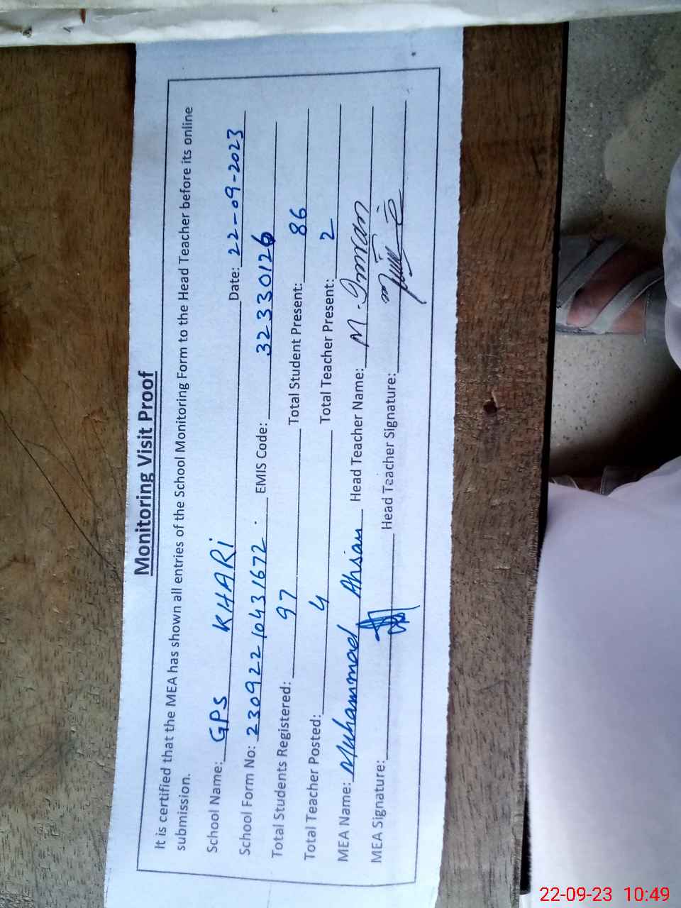 | Attendance Register | Head Teacher | MEA with School | Visit Proof |