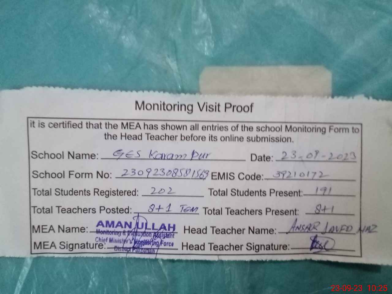 | Attendance Register | Head Teacher | MEA with School | Visit Proof |