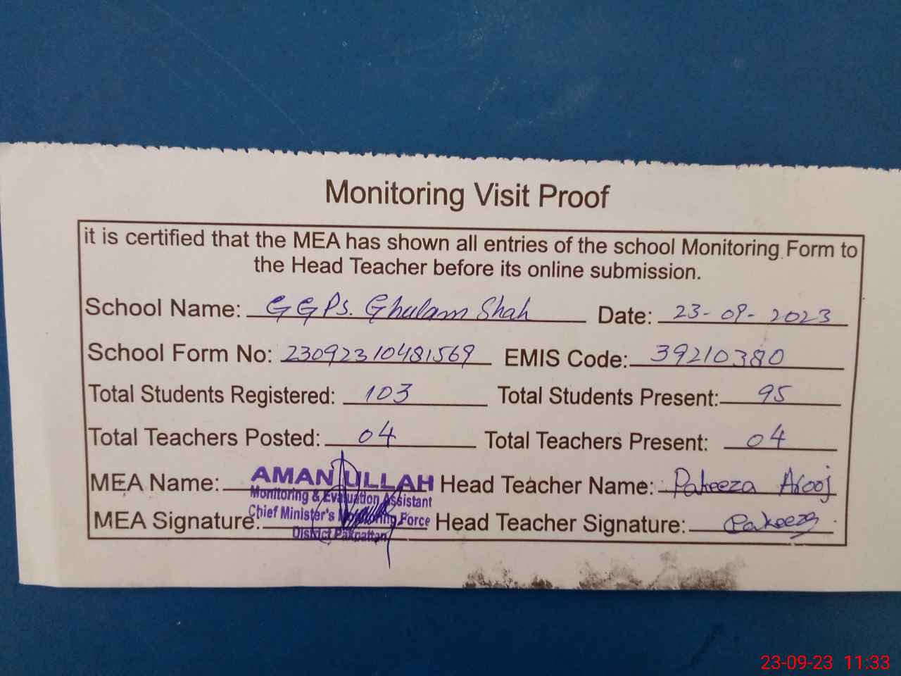 | Attendance Register | Head Teacher | MEA with School | Visit Proof |