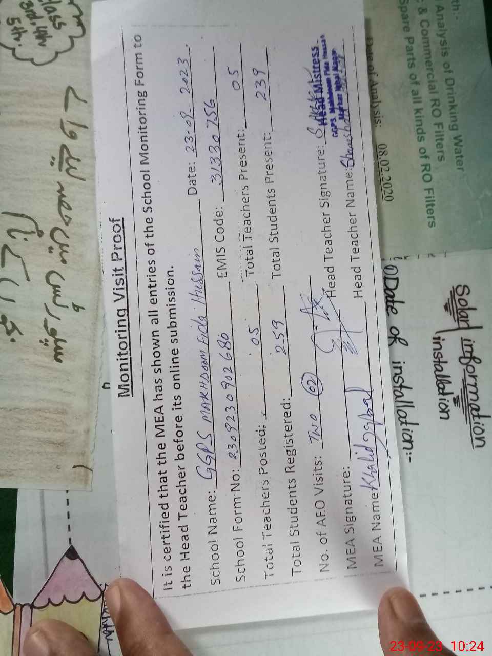| Attendance Register | Head Teacher | MEA with School | Visit Proof |