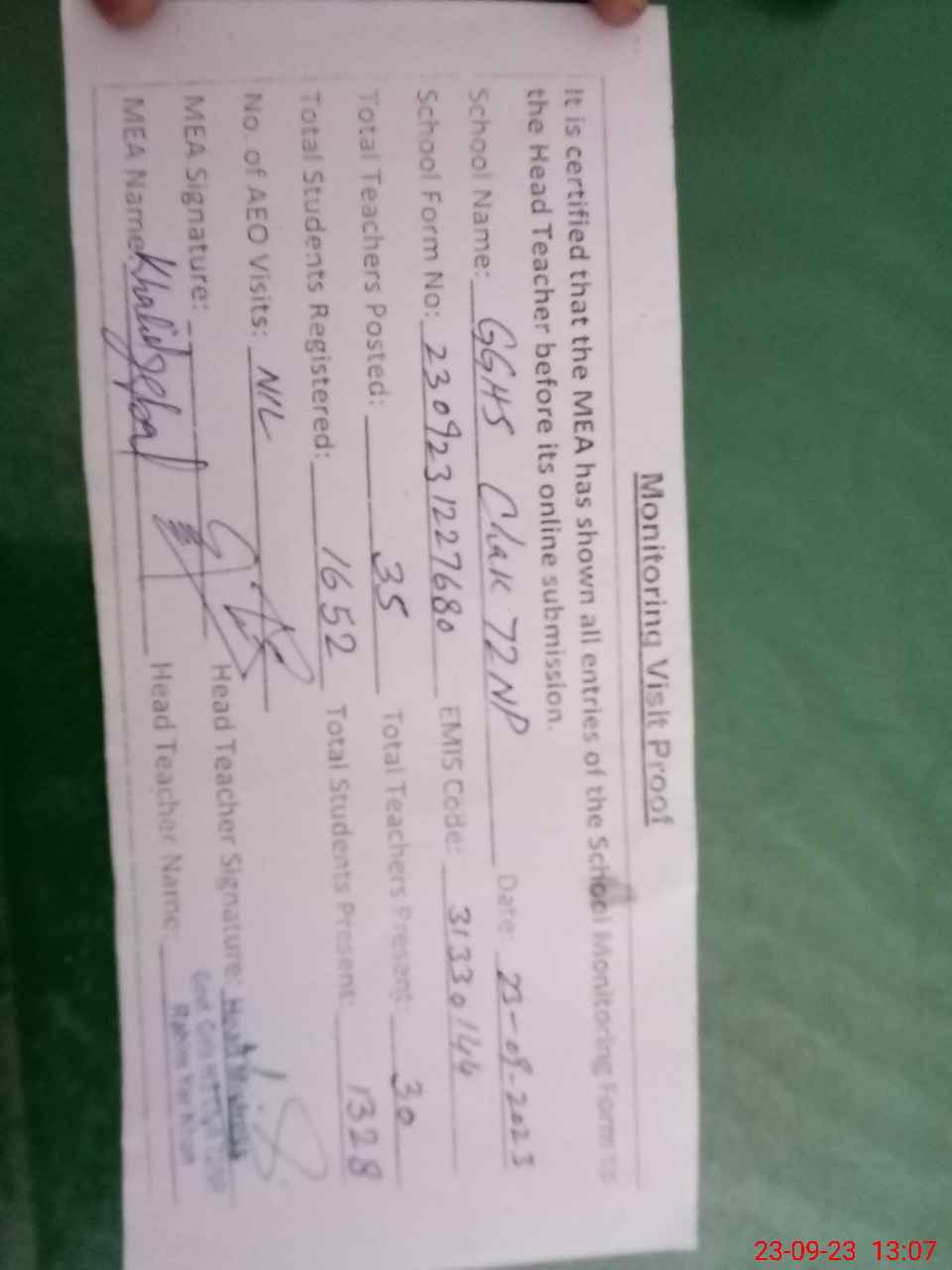 | EMIS Code: 31330144 | Name of School: GGHS CHAK NO. 72/NP | |||