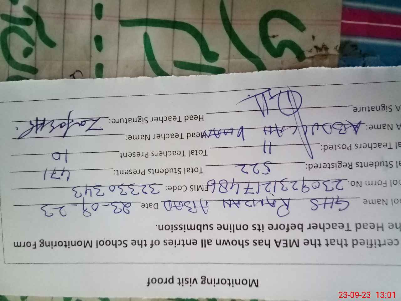| Name: AB**** HA**** Designation: (School Headmaster's/Headmistress's) S.S.T.(GEN) Phone/Cell Number: 03**** |