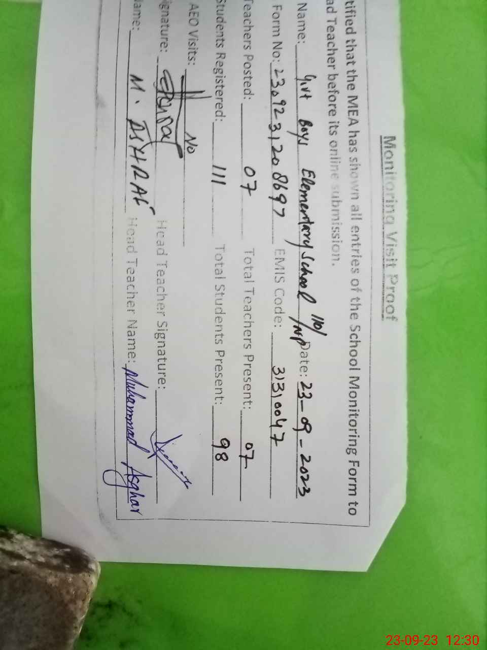 | Attendance Register | Head Teacher | MEA with School | Visit Proof |