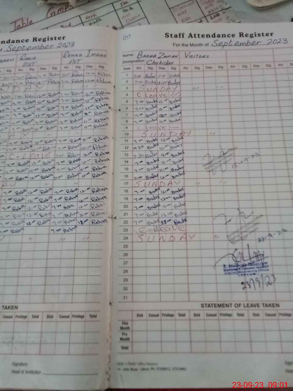 | Total no. of Classrooms: 10 No. of Classrooms Used for Teaching: 7 No. of Classrooms Storing Old Furniture, FTBs, etc: 0Comments if Any: Building requires white wash Asia Naseem PST is on C leave |