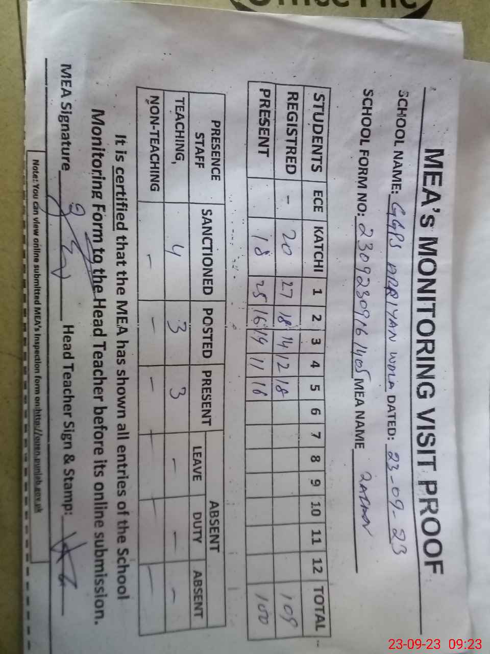 | Attendance Register | Head Teacher | MEA with School | Visit Proof |