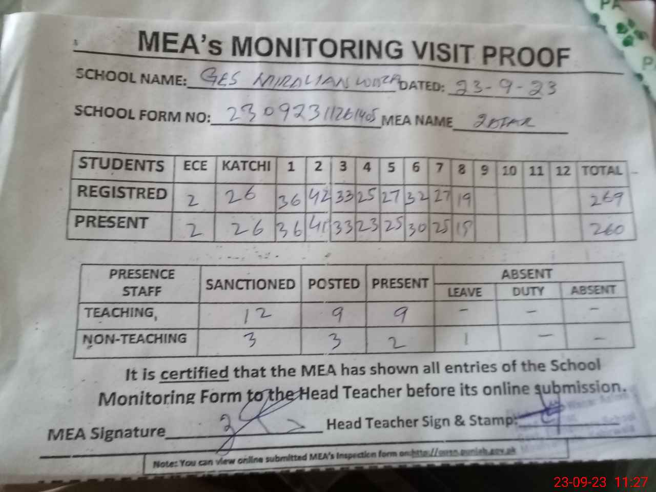 | Attendance Register | Head Teacher | MEA with School | Visit Proof |
