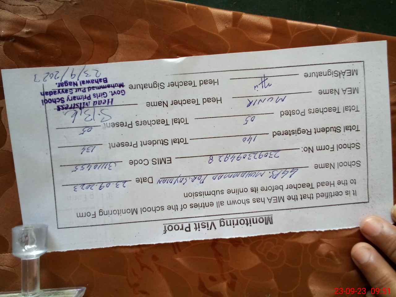 | Monitoring Date: 23-09-2023 | Start Time: 23-09-2023 09:30 AM | End Time: 23-09-2023 09:53 AM | Name of MEA: Mu**** Mu**** BN**** 08 | |