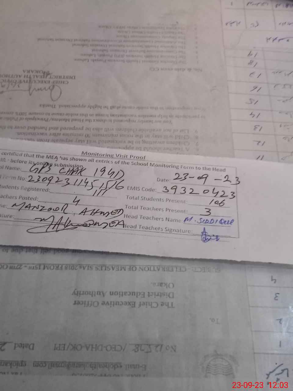 | Name: MU**** Si**** Designation: (School Headmaster's/Headmistress's) PST HM Phone/Cell Number: 03**** |
