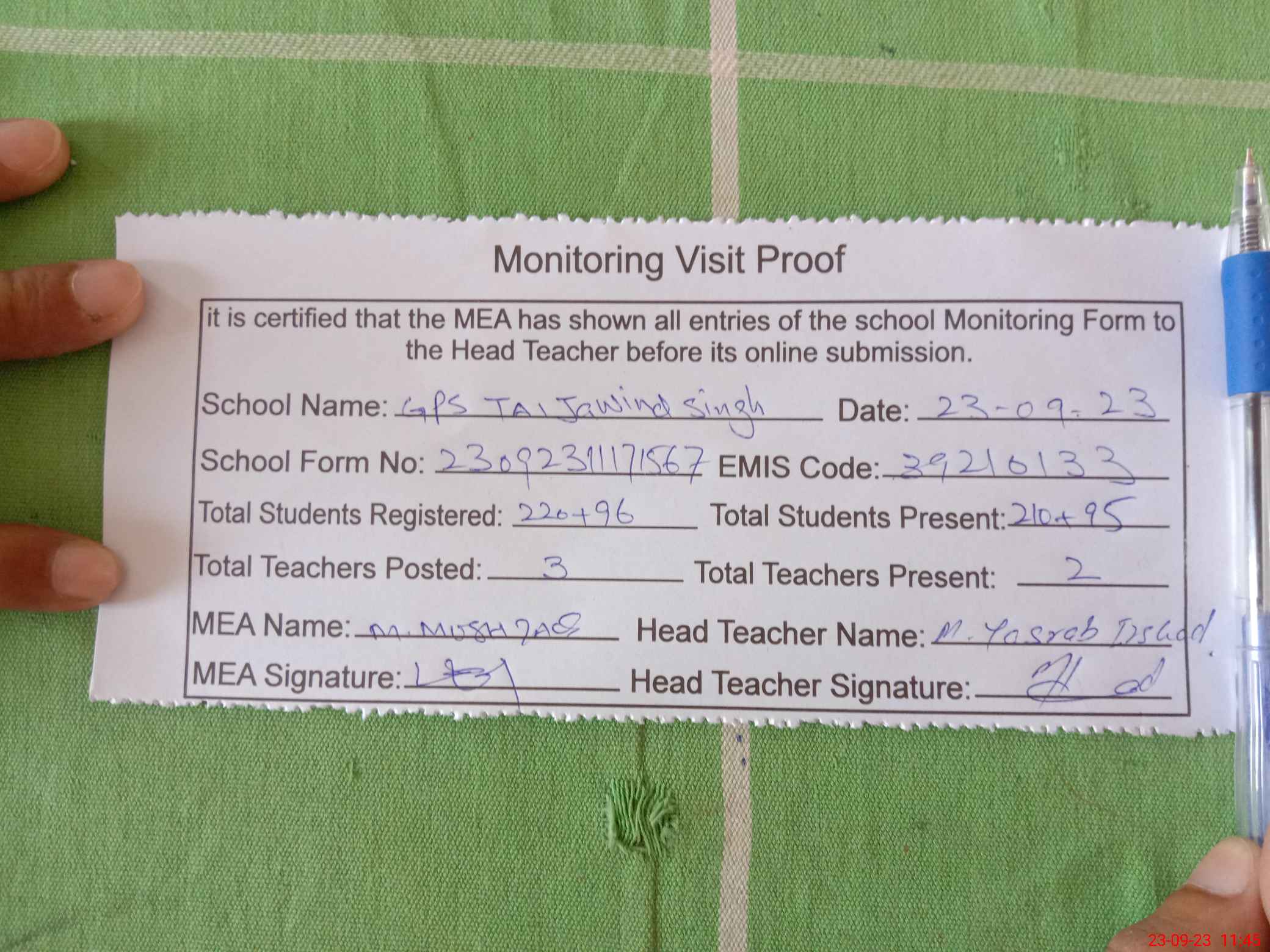 | Attendance Register | Head Teacher | MEA with School | Visit Proof |