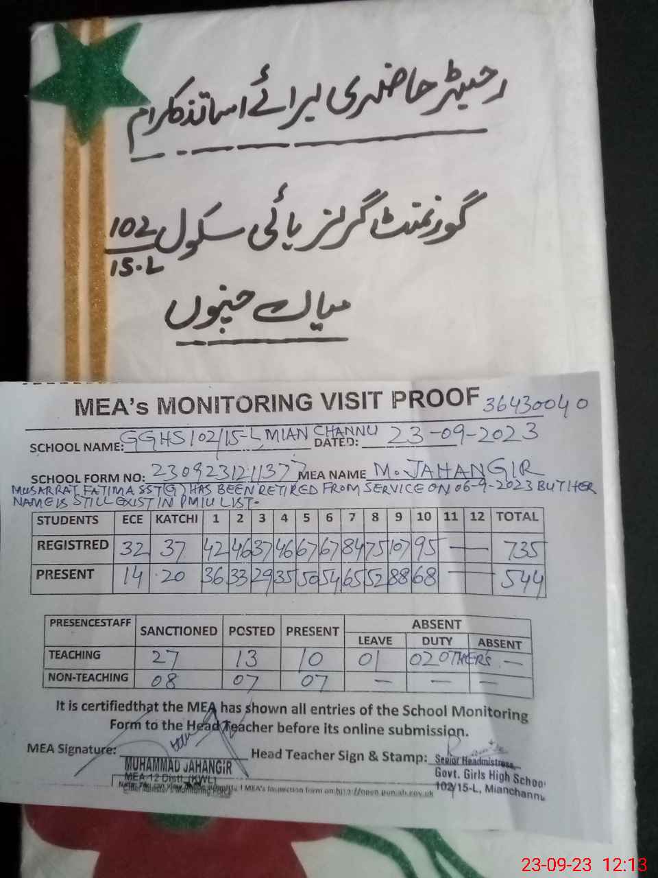 | EMIS Code: 36430040 | Name of School: GGHS 102/15-L, MIAN CHANNU | |||