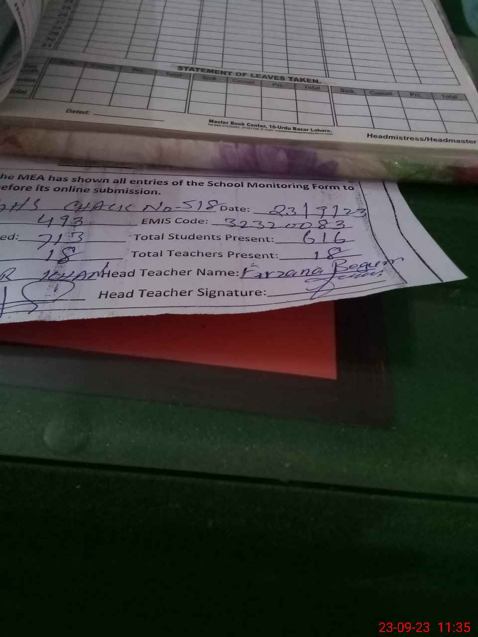 | Attendance Register | Head Teacher | MEA with School | Visit Proof |