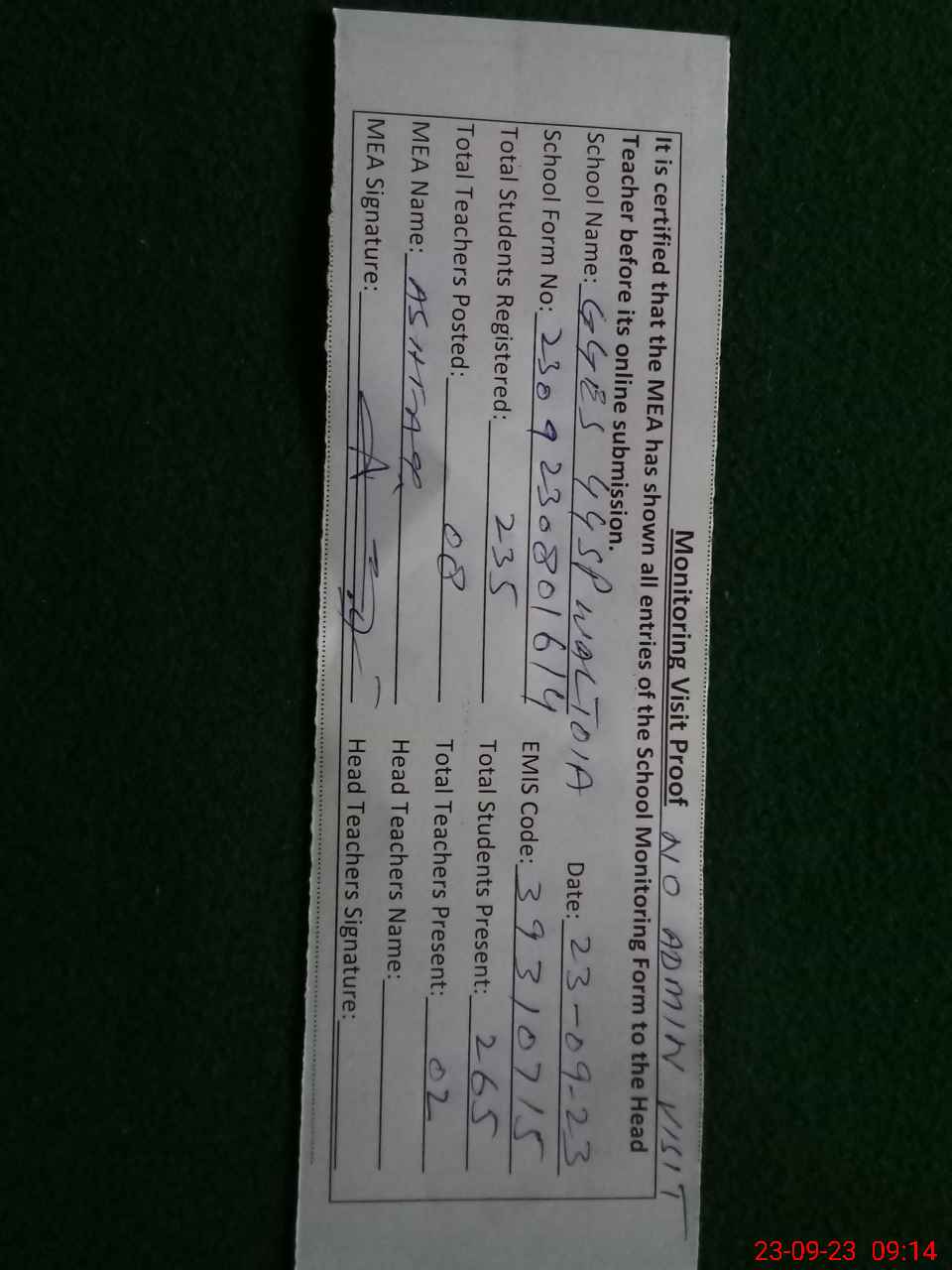 | Attendance Register | Head Teacher | MEA with School | Visit Proof |