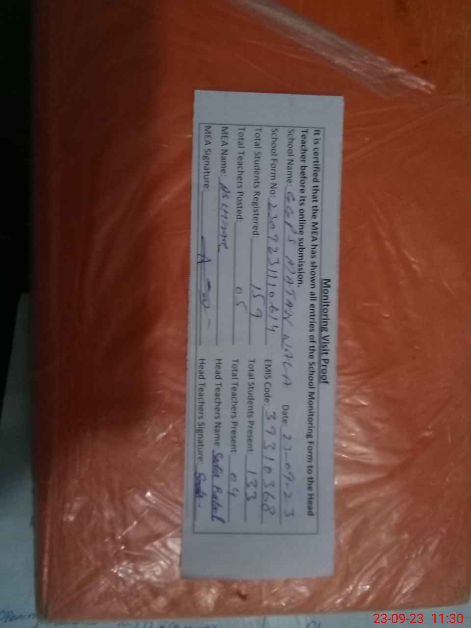 | Attendance Register | Head Teacher | MEA with School | Visit Proof |