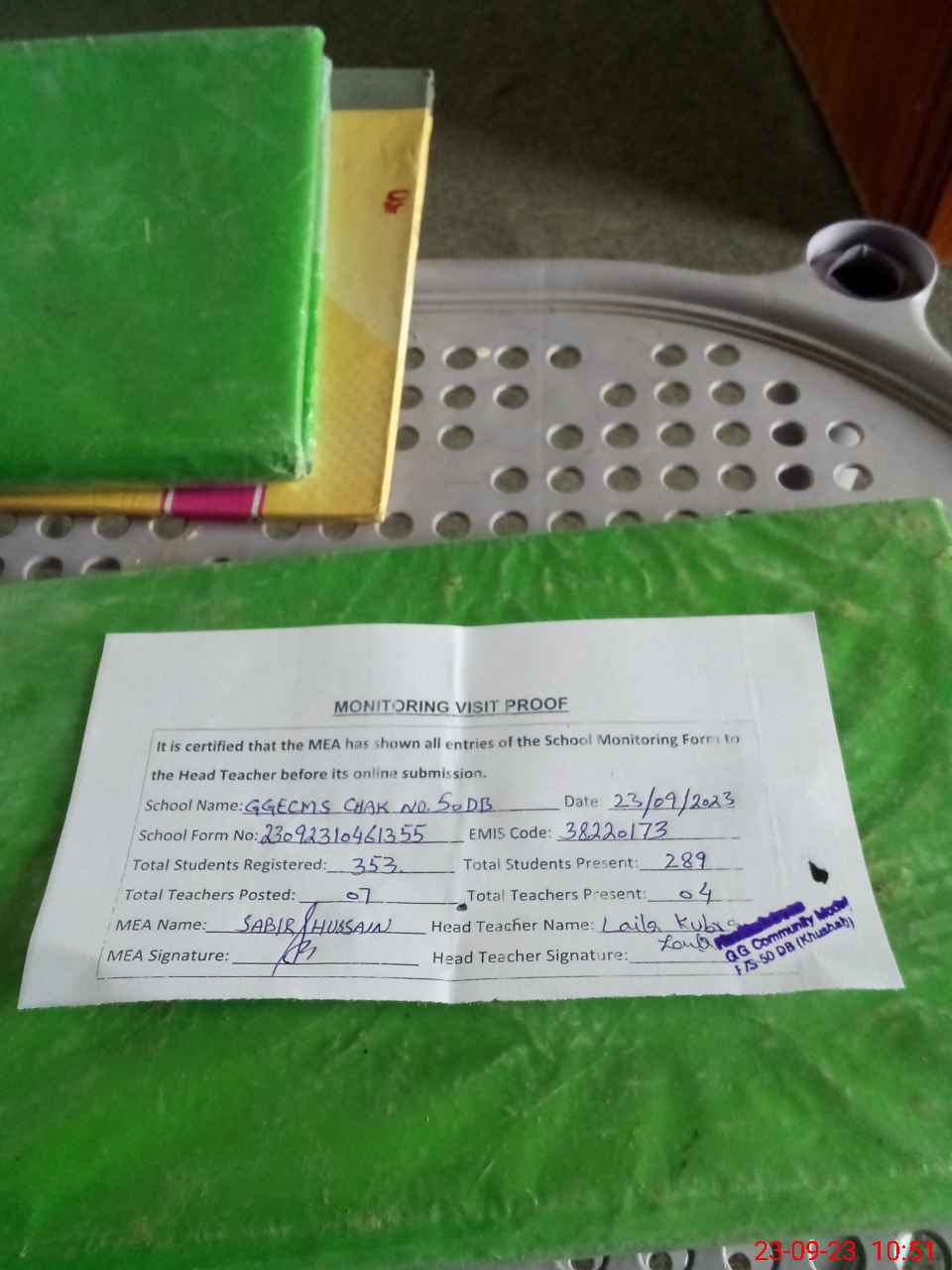 | Attendance Register | Head Teacher | MEA with School | Visit Proof |
