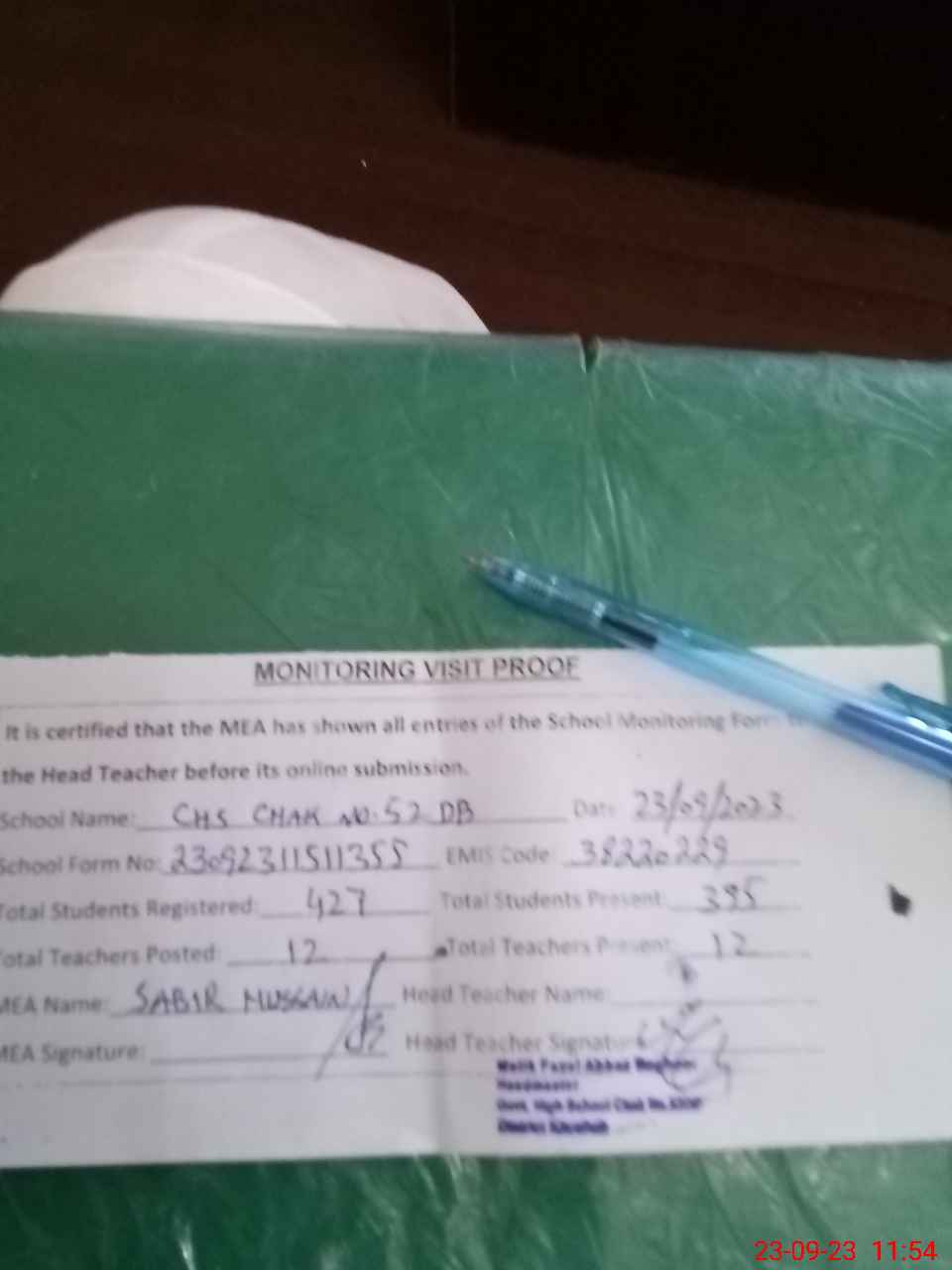 | Attendance Register | Head Teacher | MEA with School | Visit Proof |