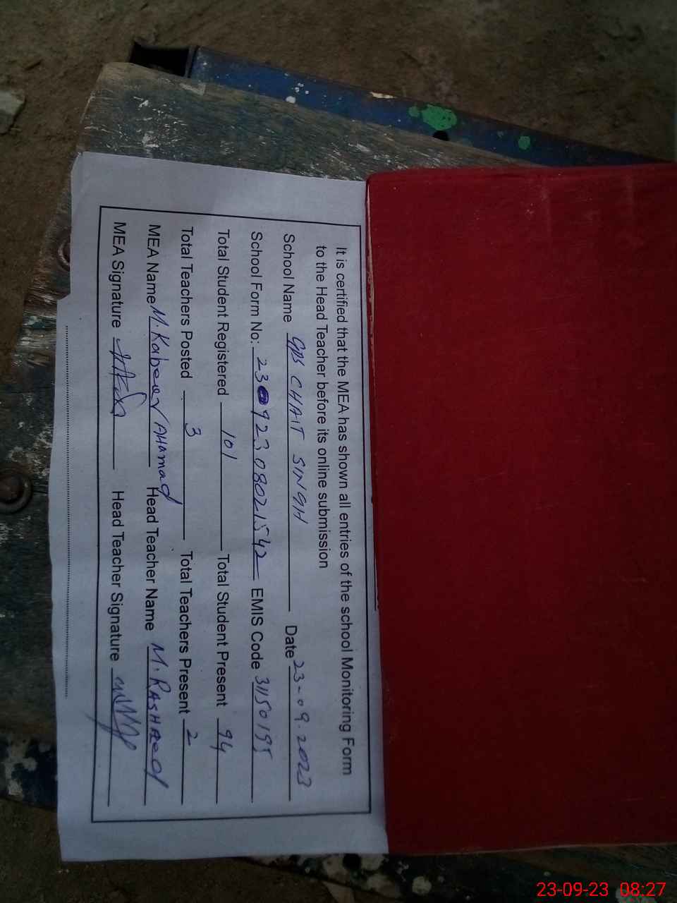 | Attendance Register | Head Teacher | MEA with School | Visit Proof |