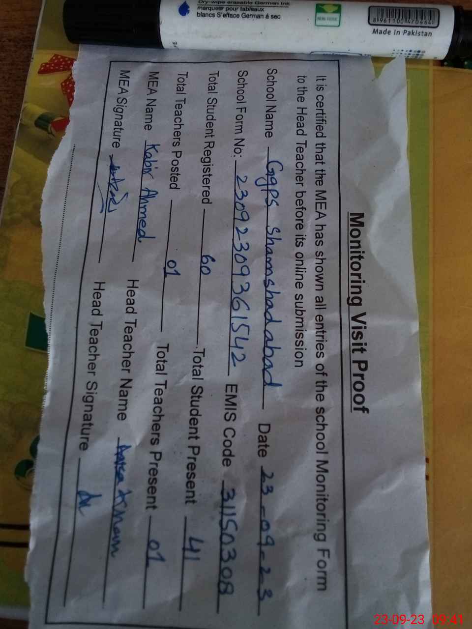 | Attendance Register | Head Teacher | MEA with School | Visit Proof |