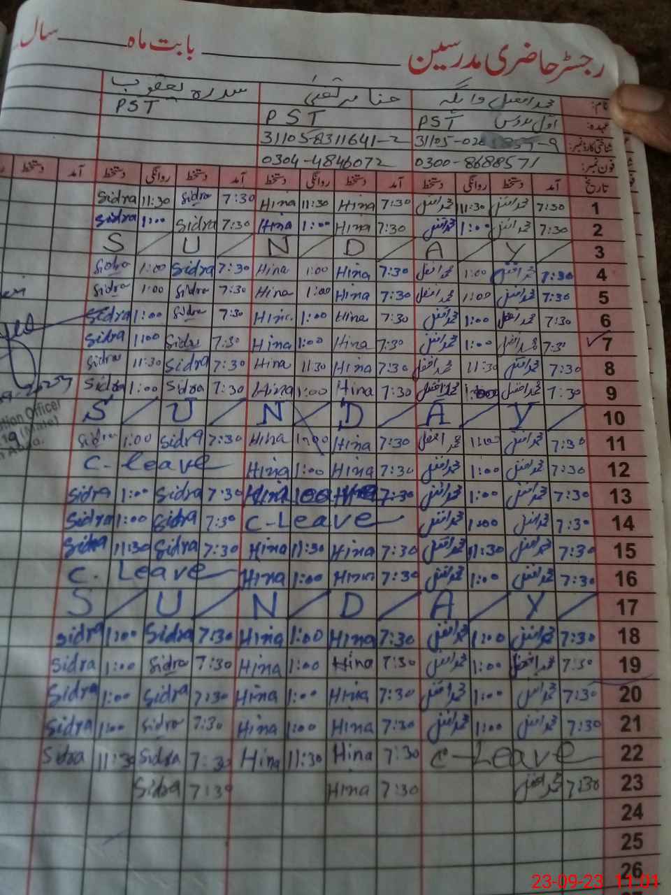 | CNIC | Full Name | Designation | R/C | Absence During Last Calender Month |